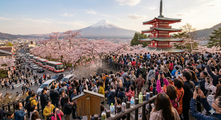 海外の反応, エンタメ・カルチャー, 経済・市場桜シーズンのオーバーツーリズムが日本各地で深刻化 富士吉田で見えた観光政策と地域限界のずれ今回の記事の重要ポイント(三点) ・富士… せかはん2026年4月11日