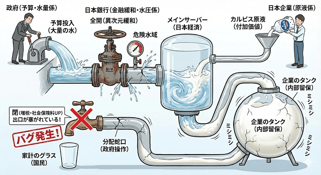 さらに悪いことに、配られたカルピスは私たちの元まで届いていません。 本来、カルピスは「政府→企業→家計(給料)」と流れるはずです。しかし、企業のタンクが巨大な「ダム」になってしまいました。
