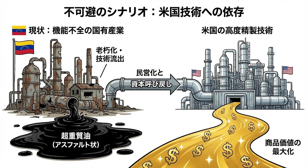 マドゥロ政権下で技術者が流出し、設備が老朽化した現在、ベネズエラの石油産業は事実上の機能不全に陥っています。