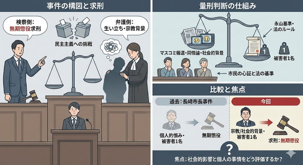 一方で、裁判はあくまで刑事責任を判断する場です。永山基準や過去の判例に照らせば、検察が死刑ではなく無期懲役を求刑した判断は、日本の量刑実務の枠内にあり、象徴性だけで刑を跳ね上げなかった現実的な選択と見ることができます。長崎市長射殺事件との比較からも、社会的影響がいかに大きくとも、被害者が1人である場合の量刑判断には一定の線引きが存在することが分かります。