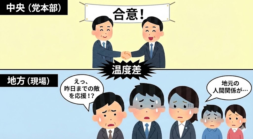 中央での合意と、地方の感情や人間関係は必ずしも一致しません。