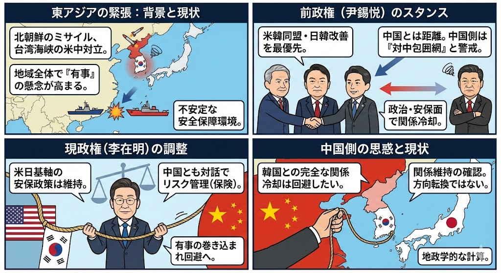 今回の中韓首脳会談は、地域の緊張が高まる中で、両国が関係を過度に悪化させないよう調整を行ったものと整理できます。韓国が中国との対話を重ねる姿勢を示したことは事実ですが、それは既存の外交・安全保障の枠組みを組み替える動きというより、選択肢を狭め過ぎないための現実的な対応と見る方が実態に近いでしょう。