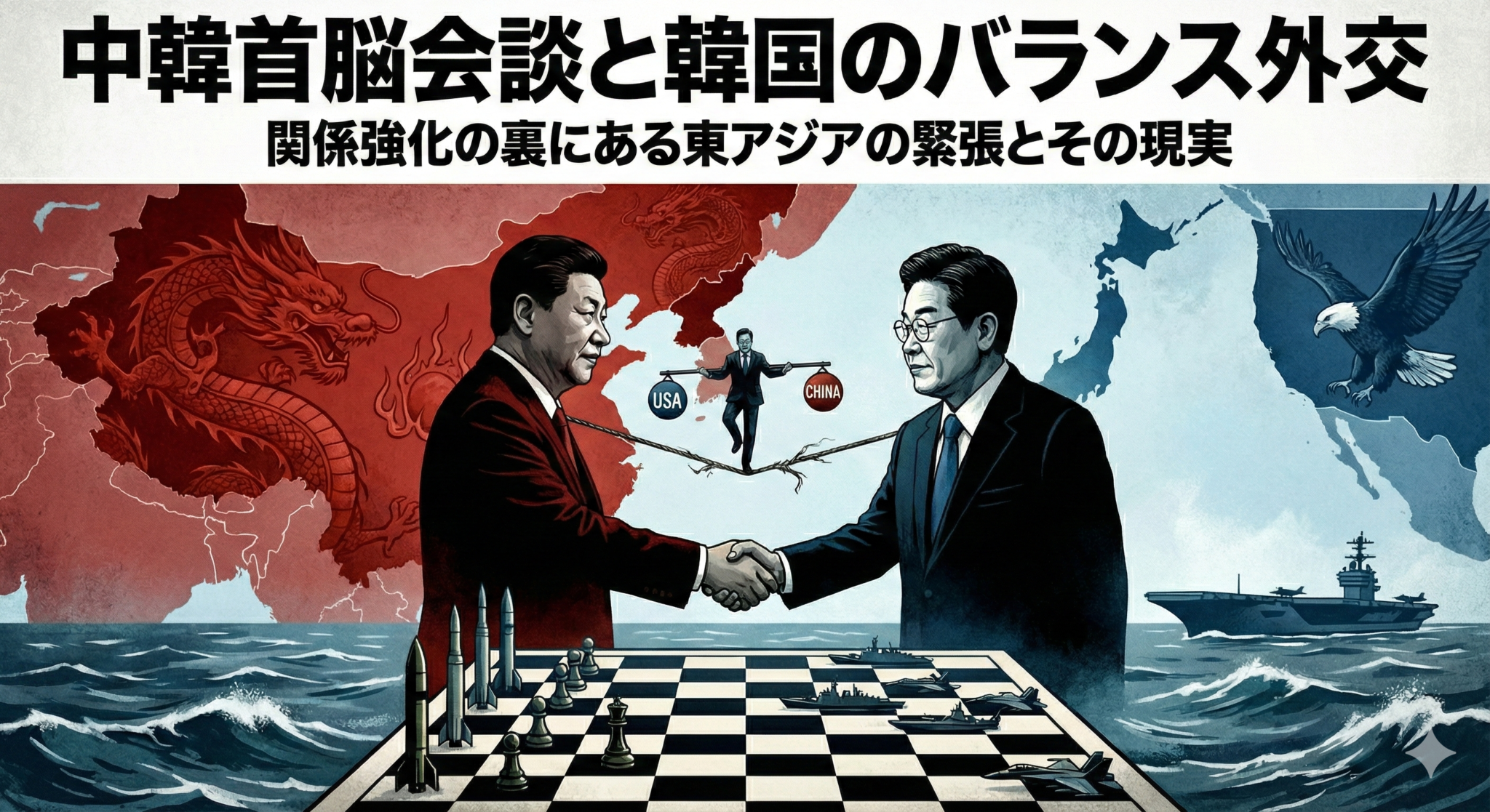 ニュース 中国の習近平国家主席と韓国の李在明大統領は1月5日、北京で首脳会談を行い、両国関係を強化する方針を確認した。会談では、経済・貿易・技術分野を中心に協力を深めることで一致し、地域の平和と安定を維持する重要性が強調 … 続きを読む 中韓首脳会談と韓国のバランス外交 関係強化の裏にある東アジアの緊張とその現実