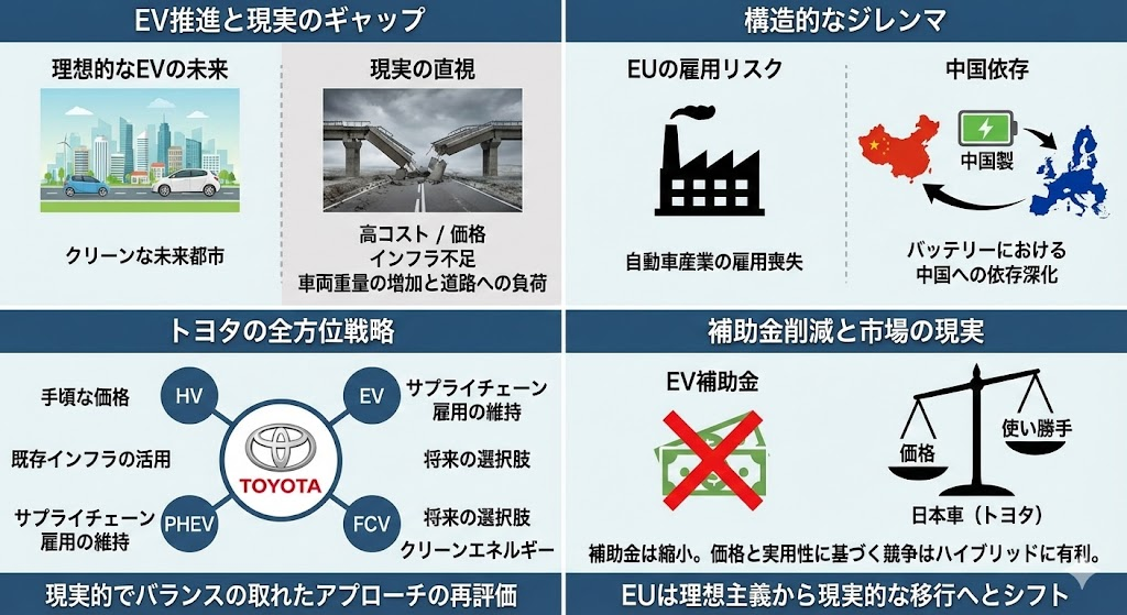 EV一本に賭けた理想主義が、需要、雇用、地政学という現実の壁に突き当たり、産業政策としての再設計を迫られた結果です。