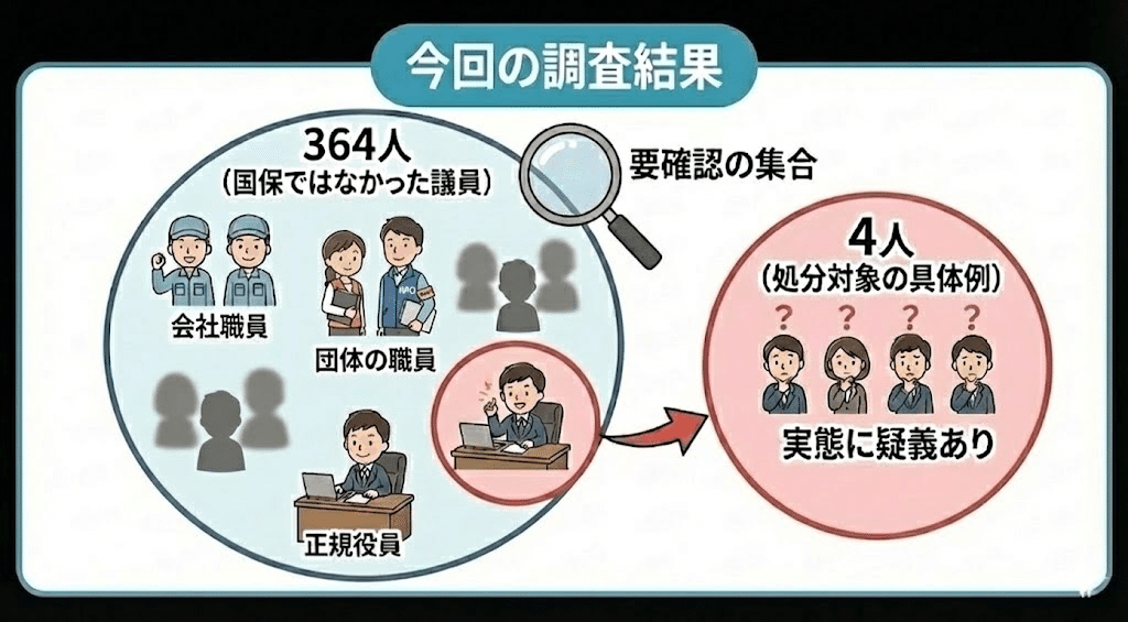 364人という数字は、国民健康保険ではない加入形態だった議員の数を示すものであり、その全員が不正と認定されたわけではありません。