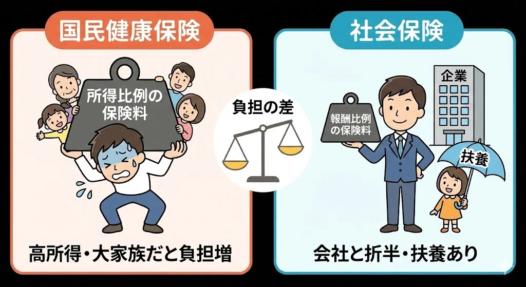 国保と社保の間には、立場や収入形態によって負担が急に変わる接続点があります。