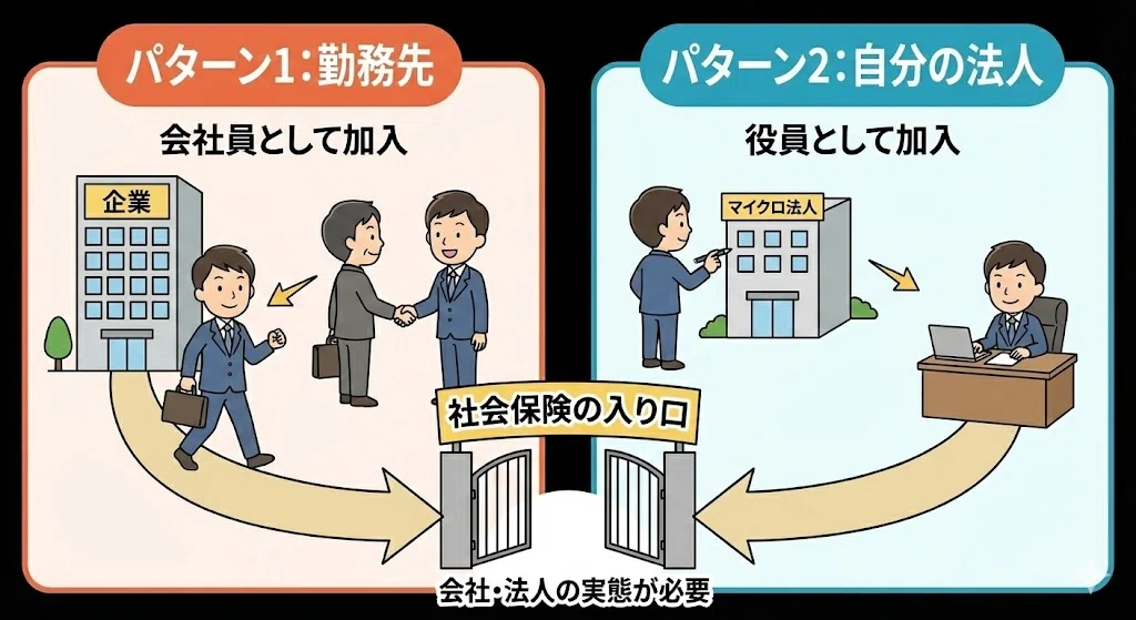 そのため、社会保険に加入する経路は現実にはいくつかの形に分かれます。