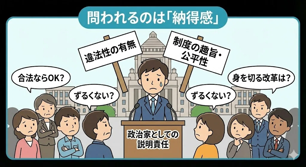 その立場にある議員が、制度の切り替えによって自らの負担を下げていたとなれば、合法であっても有権者の受け取り方は厳しくなります。