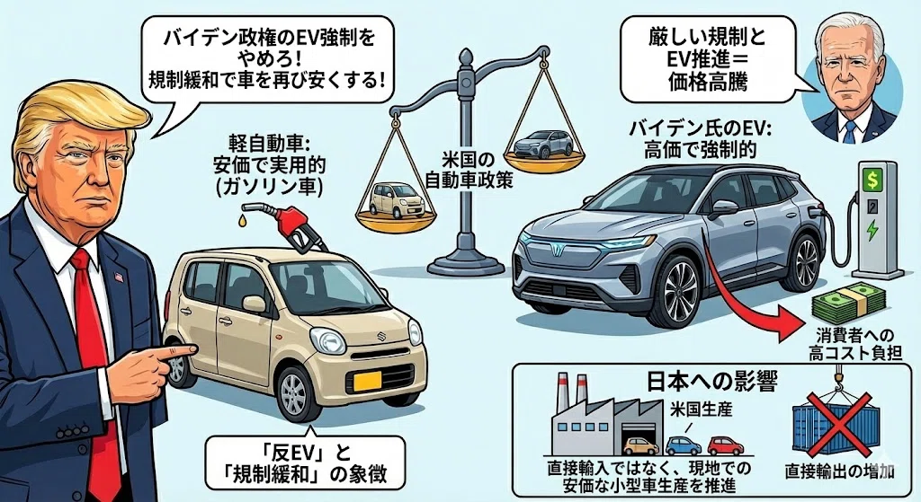 トランプ大統領の軽自動車発言は、一見すると日本の乗り物を称賛した話に見えますが、本質的にはバイデン政権が推進してきた環境規制やEV政策への対抗軸として語られたものです。バイデン政権下では排ガス基準や燃費基準が強化され、新車のEV比率を大幅に引き上げる政策が導入されてきました。トランプ氏はこれを「車を高くして消費者の負担を増やす政策」と批判し、規制の見直しを次々に打ち出しています。
