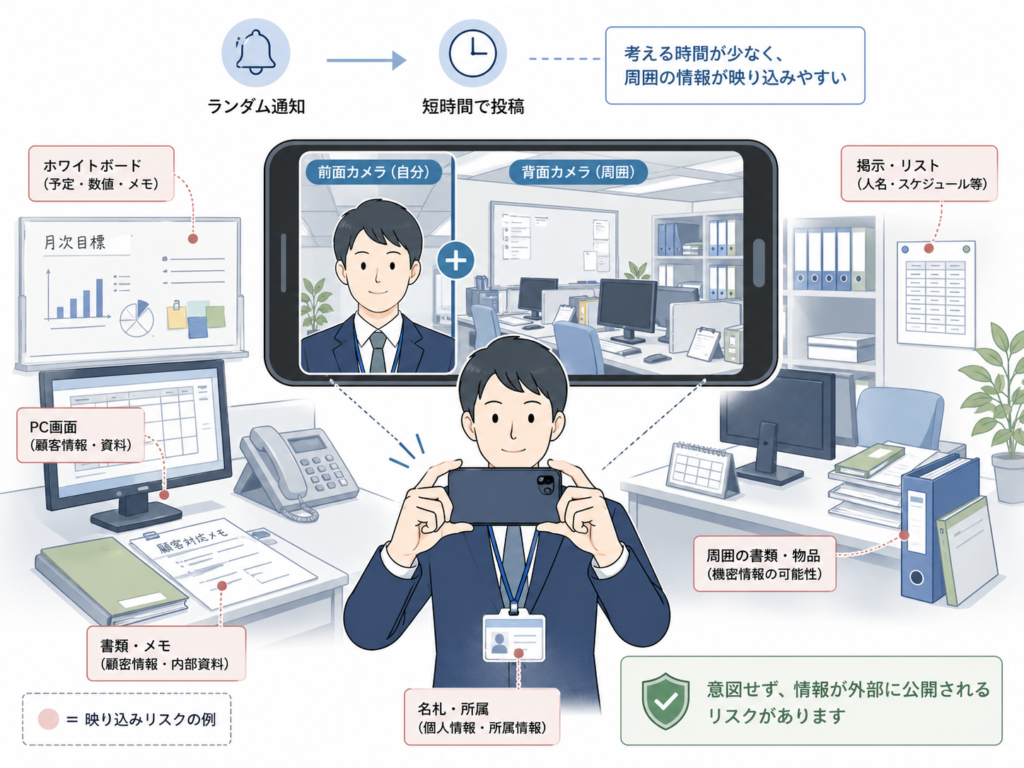 前後カメラで周囲を撮る仕組みや、その場の空気感を共有する文化が、職場での映り込みリスクを高めた面はあります。