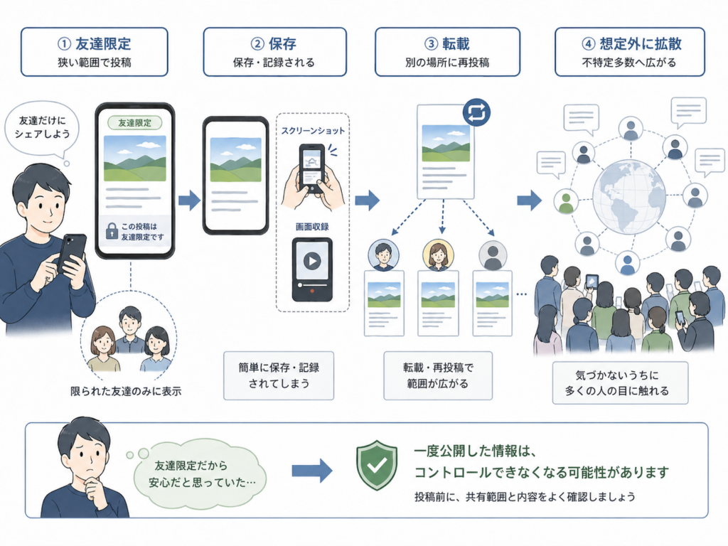 公開範囲を限定していても、安全とは言い切れません。見た人がスクリーンショットや画面録画で保存し、別のSNSへ転載すれば、投稿者の想定を超えて広がります。