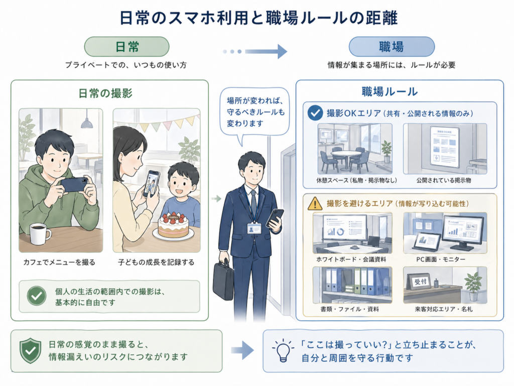 職場では、撮影してよい場所といけない場所、私物スマホを使ってよい場面と避けるべき場面を分けて考える必要があります。