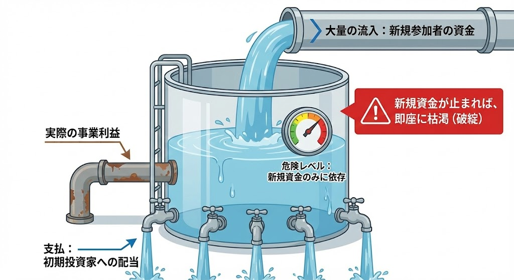 このような仕組みは、新規の預託や参加が止まった瞬間に破綻します。